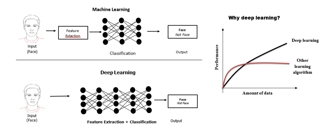 Deep Learning self extracts features with a deep neural networks and classify itself. Compare to traditional Algorithms it performance increase with Amount of Data.