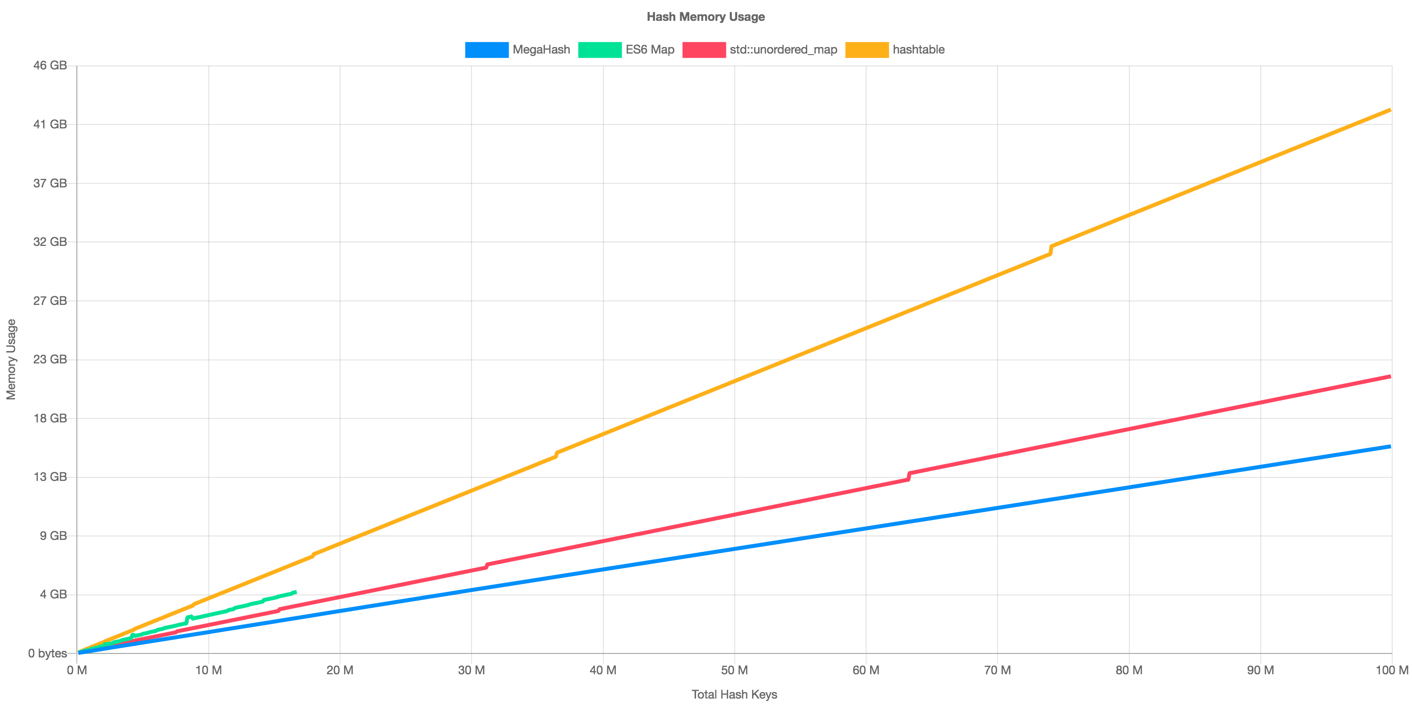 A few things to note here. First, with hash sizes under 5 million keys, the native Node.js ES6 Map absolutely blows everything else out of the water. It is lightning fast. However, as you can see, performance dips quickly thereafter, and the line stops abruptly around 15 million keys, which is where Node.js crashes. This seems like some kind of hard key limit with Maps, as it dies here every time (yes, I increased the memory with --max-old-space-size).