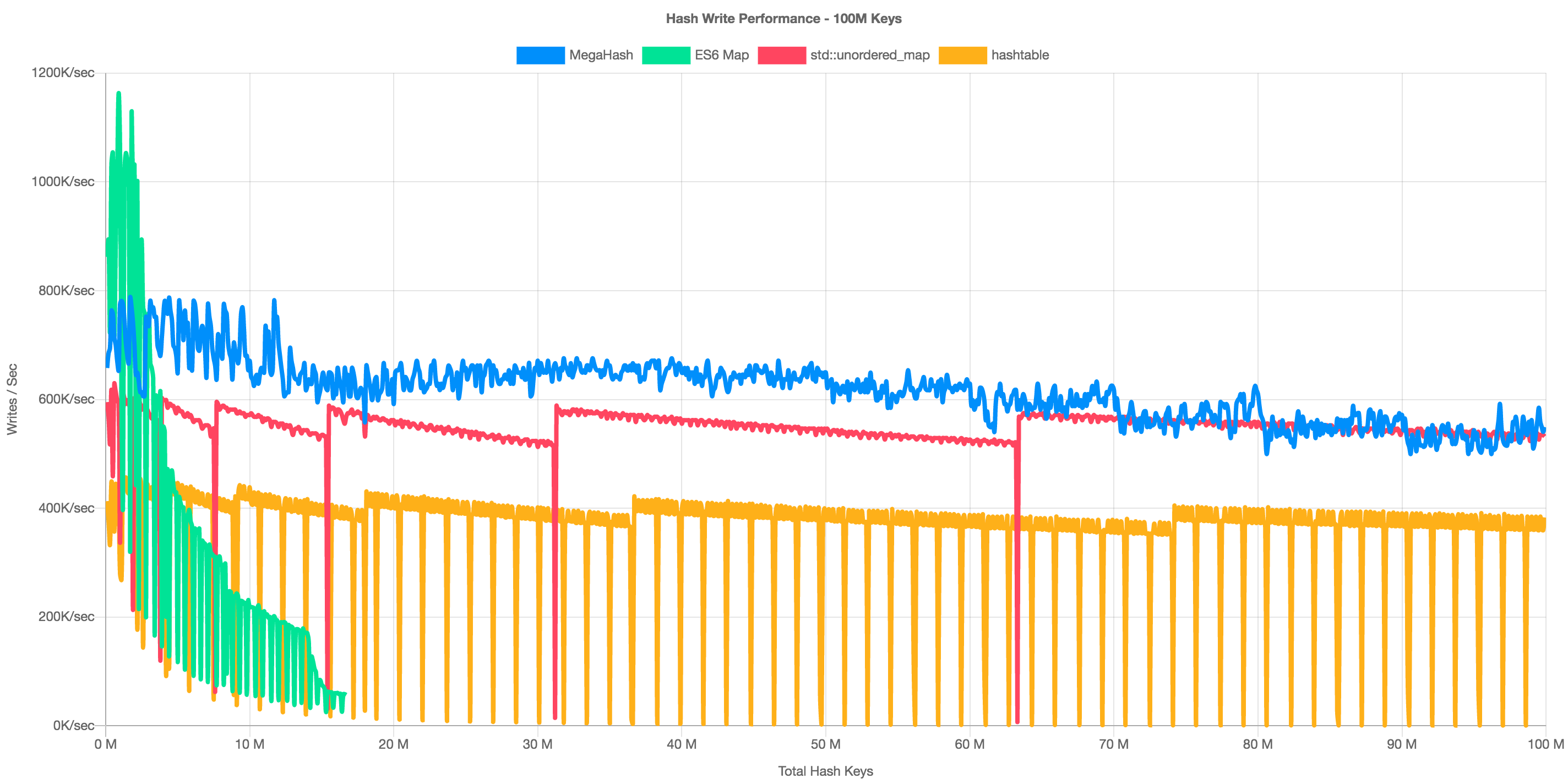 The NPM hashtable module made it all the way, but unfortunately has some severe performance dips, where it totally stalls out for up to a minute or more, then picks back up again. This trend continues all the way to 100M keys. The overall average was only 30,000 keys per second for this module, due to all the stalling.