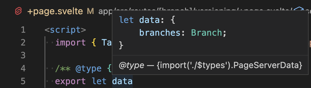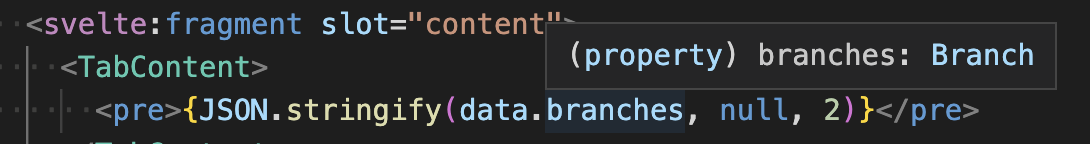 Branchtype shows up, but I want to see the whole interface forBranch.But in +page.svelte, when I hover data.branches I see this:
