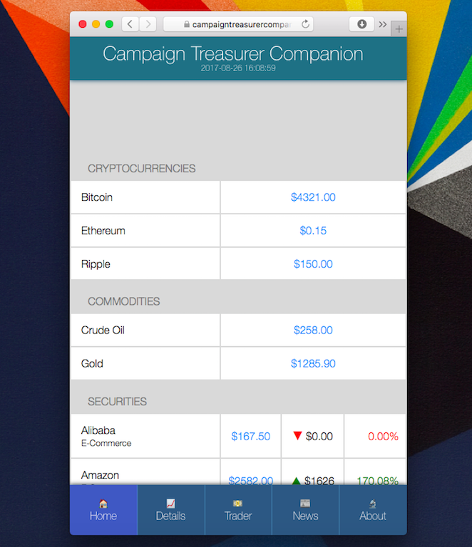Campaign Treasurer Companion Web App The Web Application features a Simulated Stock and Commodity Market with the facility to allow Virtual Trading. The Campaign Treasurer Companion for Prayas fest. Written as a web-app to allow cross-platform support.