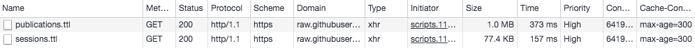 The payload of the `.ttl` files is massive and the cache headers (due to GitHub defaults) aren't optimal:  Consider [add](https://developer.mozilla.org/en-US/docs/Web/API/Cache/add)ing the `.ttl` files to `window.caches` (with potentially an IndexedDB fallback) for improved repeat loads.