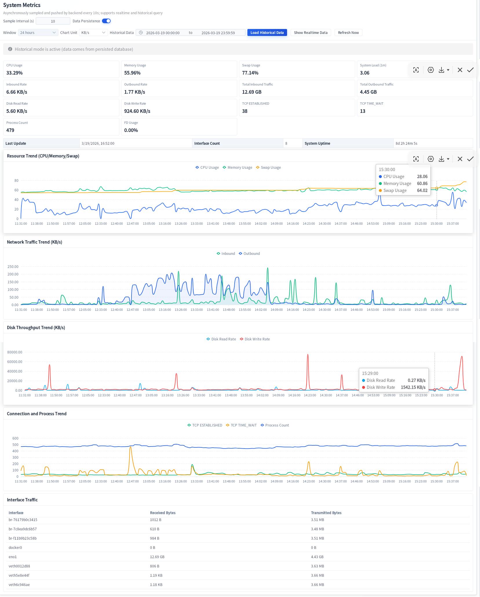 - System metrics module (Linux/Windows): real-time + historical charts for CPU, memory, swap, network, disk throughput, TCP states, process/file descriptor counts, and uptime