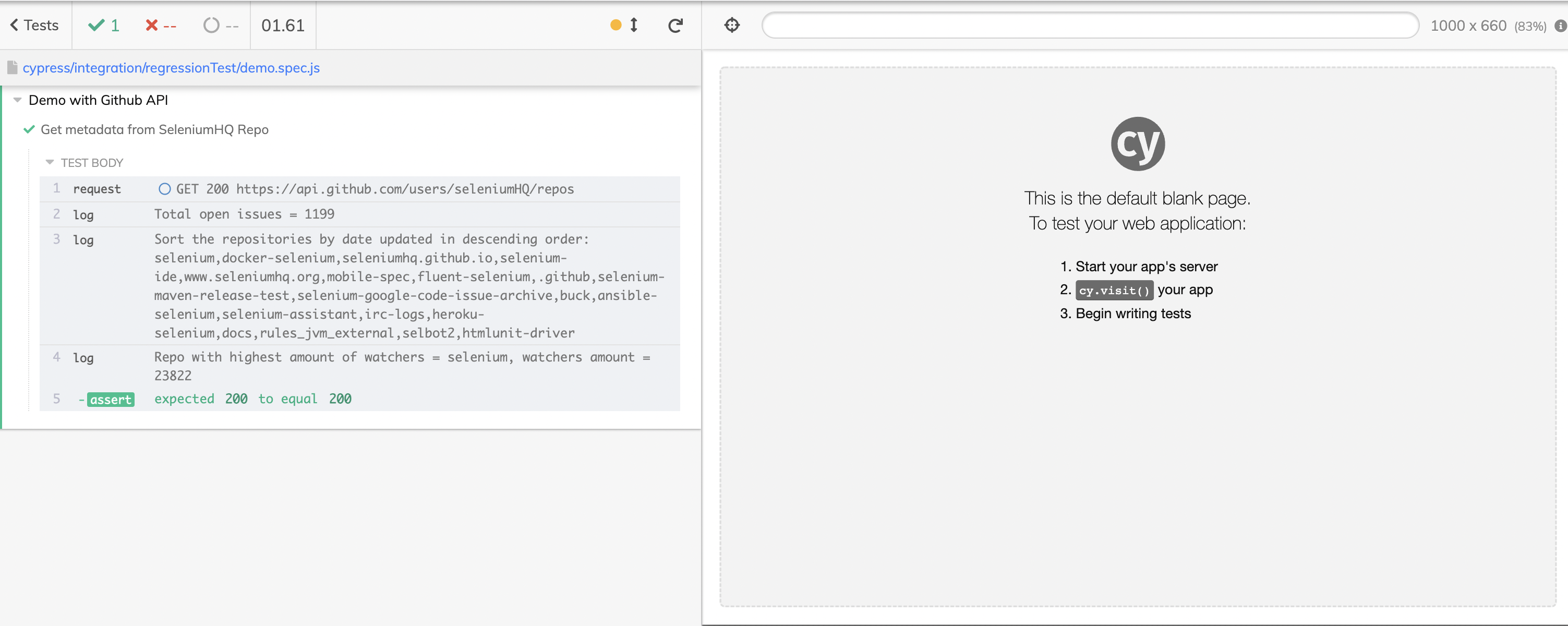 - Open Terminal inside Visual Studio Code, Run command [ npx cypress open ] to start Cypress, select demo.spec.js [Screenshot 4] to start the run and see the log [Screenshot 5]