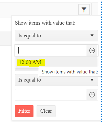 - Open the filter menu again, click on the drop-down, you can see that the only item on that list for time picker is 12am.