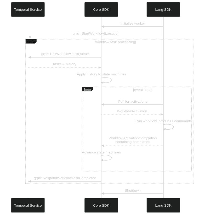 15+ Core communicates with the Temporal service in the same way that existing SDKs today do, via