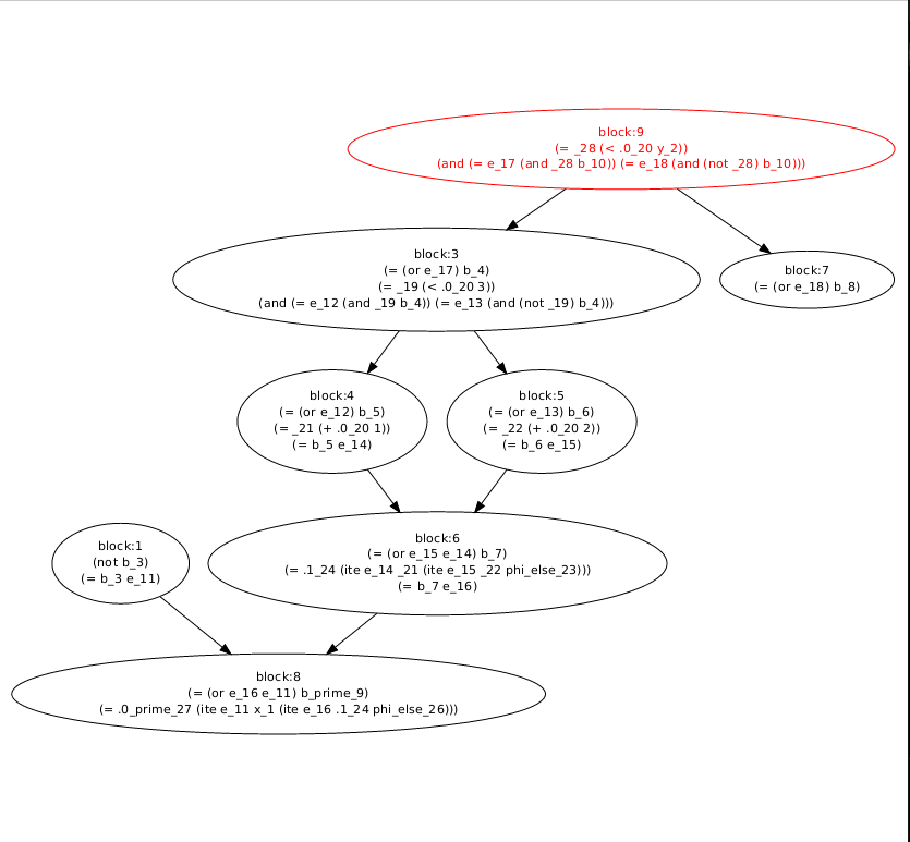 - Build a graph of the same shape containing lists of clauses. Each clauses is build by encoding an llvm instruction into an smt term. Note that the encoding differanciate variables in vertexes that were splited and contains only phi node. We call these variables "primed" as we want to distinguish them from their counterpart in the other node.