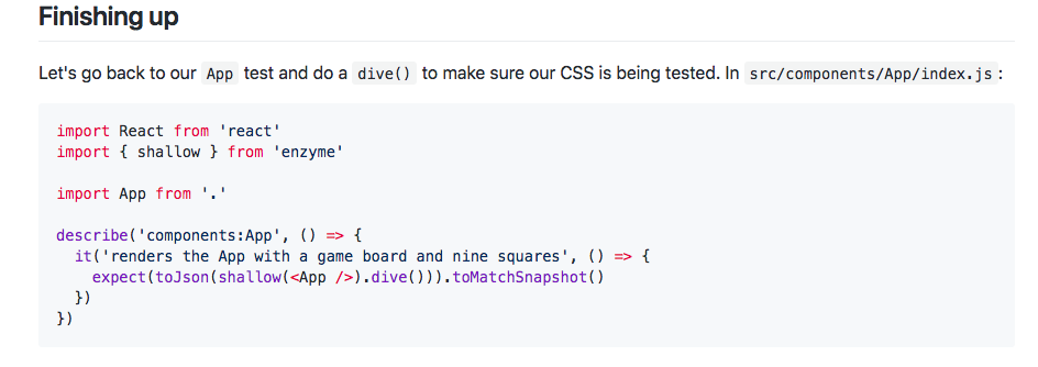 On branch 02-add-snapshots, in the README, it's suppose to say src/components/App/index.spec.js instead of src/components/App/index.js (as shown in the screenshot)