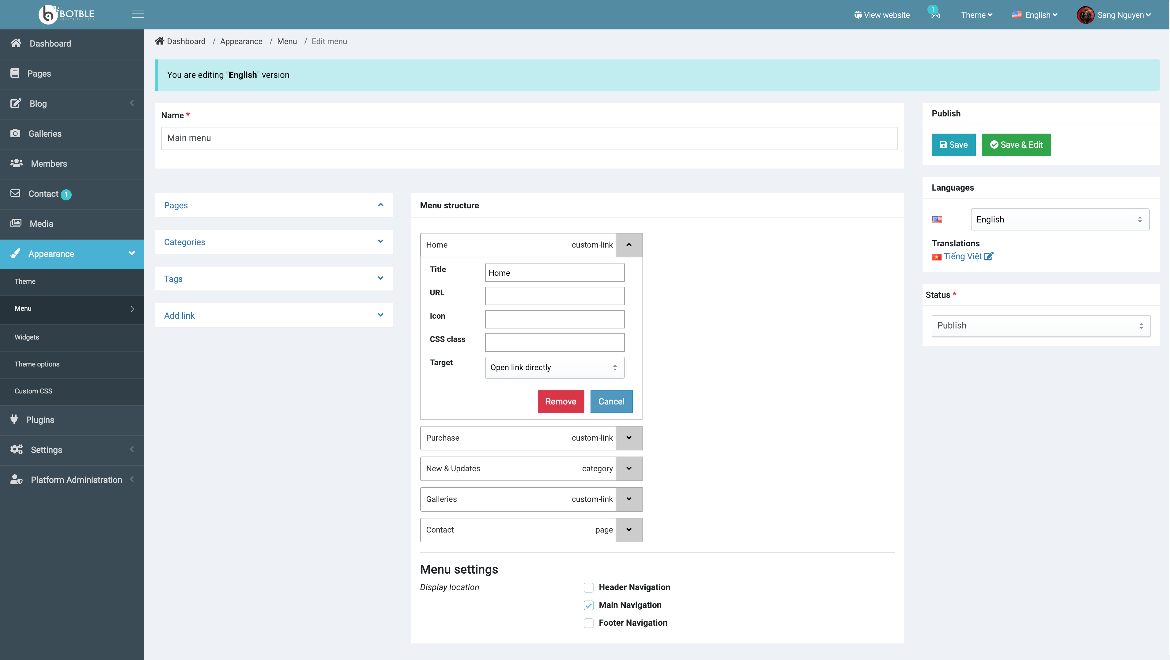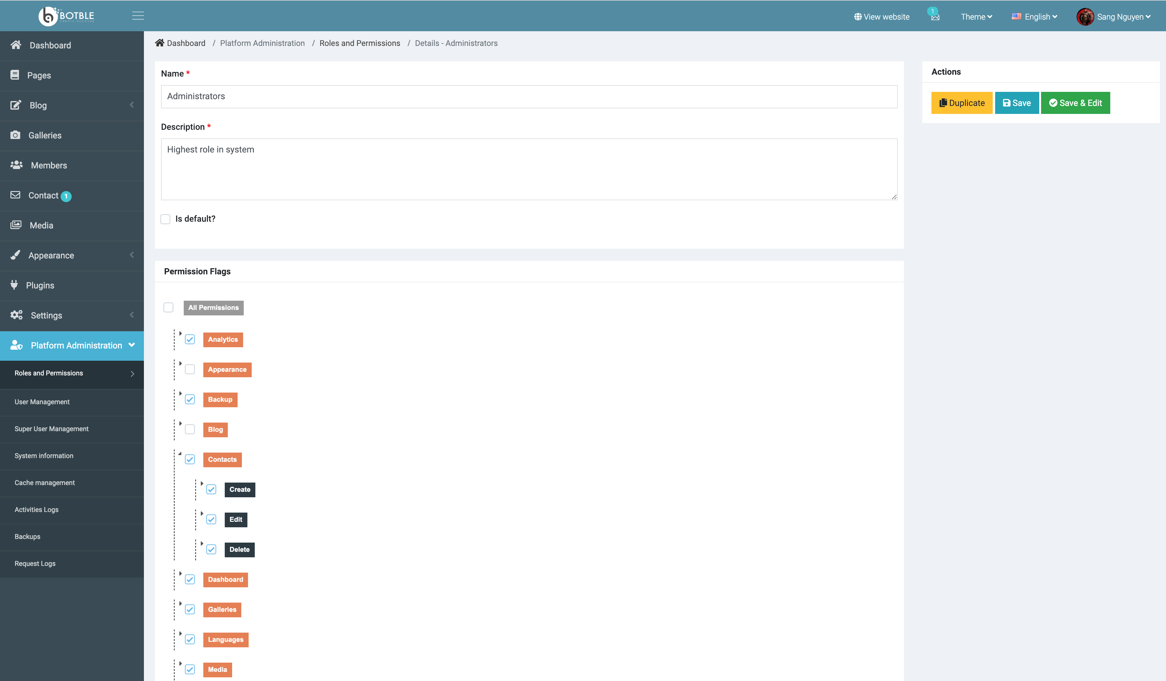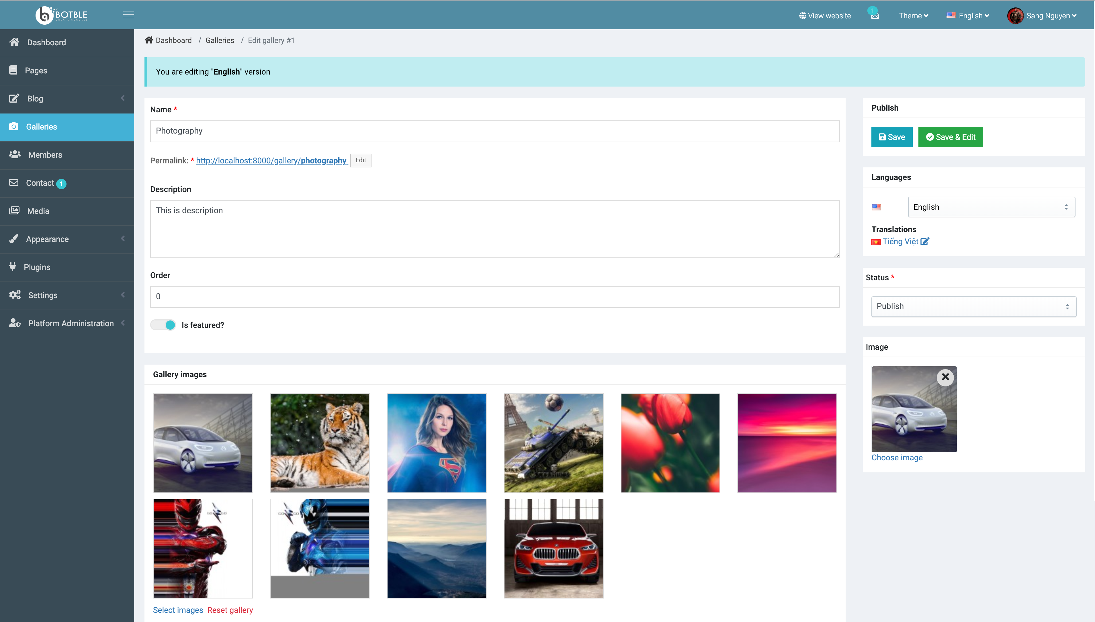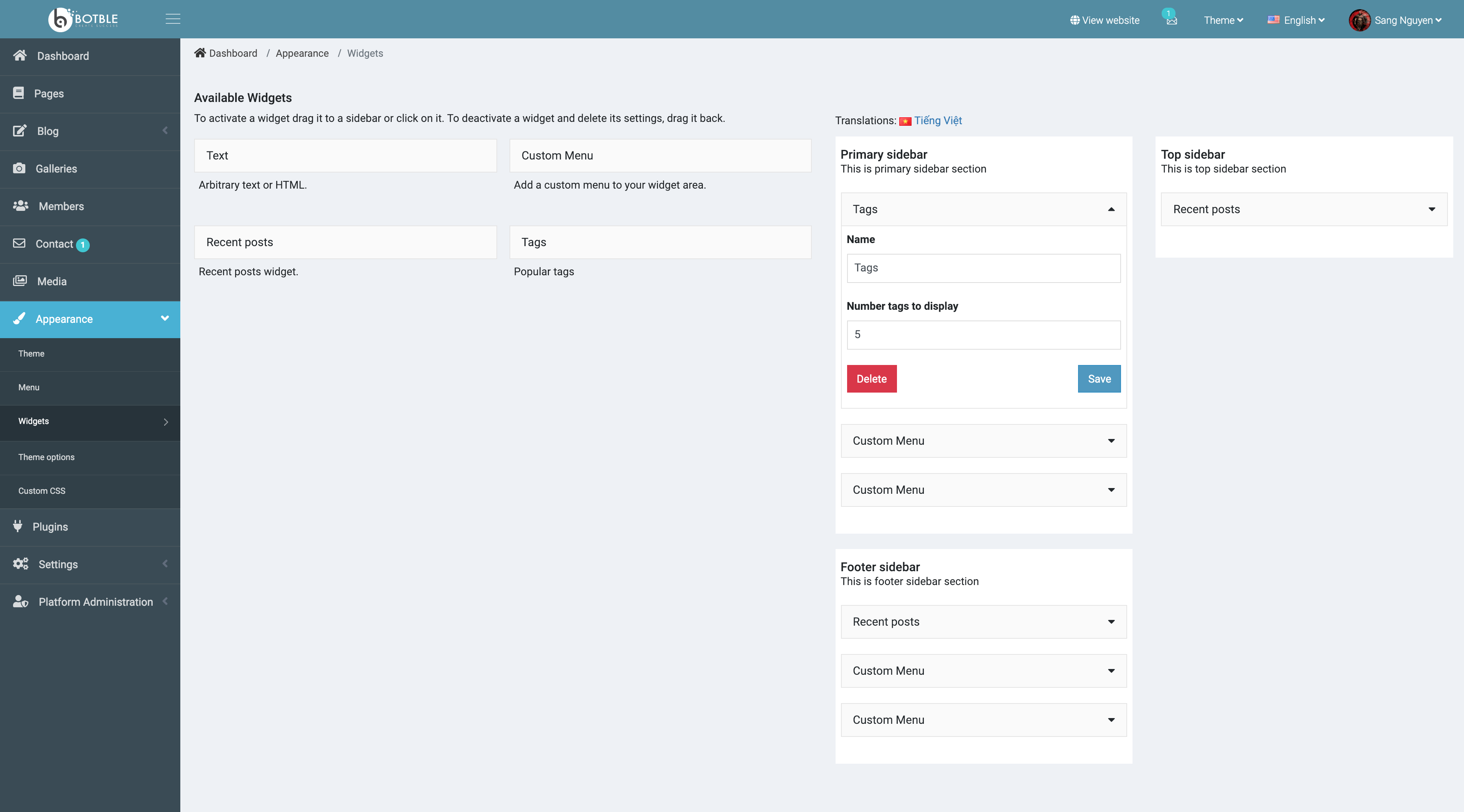 Screenshots 1/ Dashboard Dashboard with Google Analytics, recent posts, error logs... 2/ CRUD 3/ Theme 2 themes already now. 4/ Menu 5/ Widget This widget likes with WordPress widget. 6/ Theme options 7/ Gallery 8/ Media 9/ Plugins There are many plugins for you now. 10/ Roles & Permissions 11/ Other features