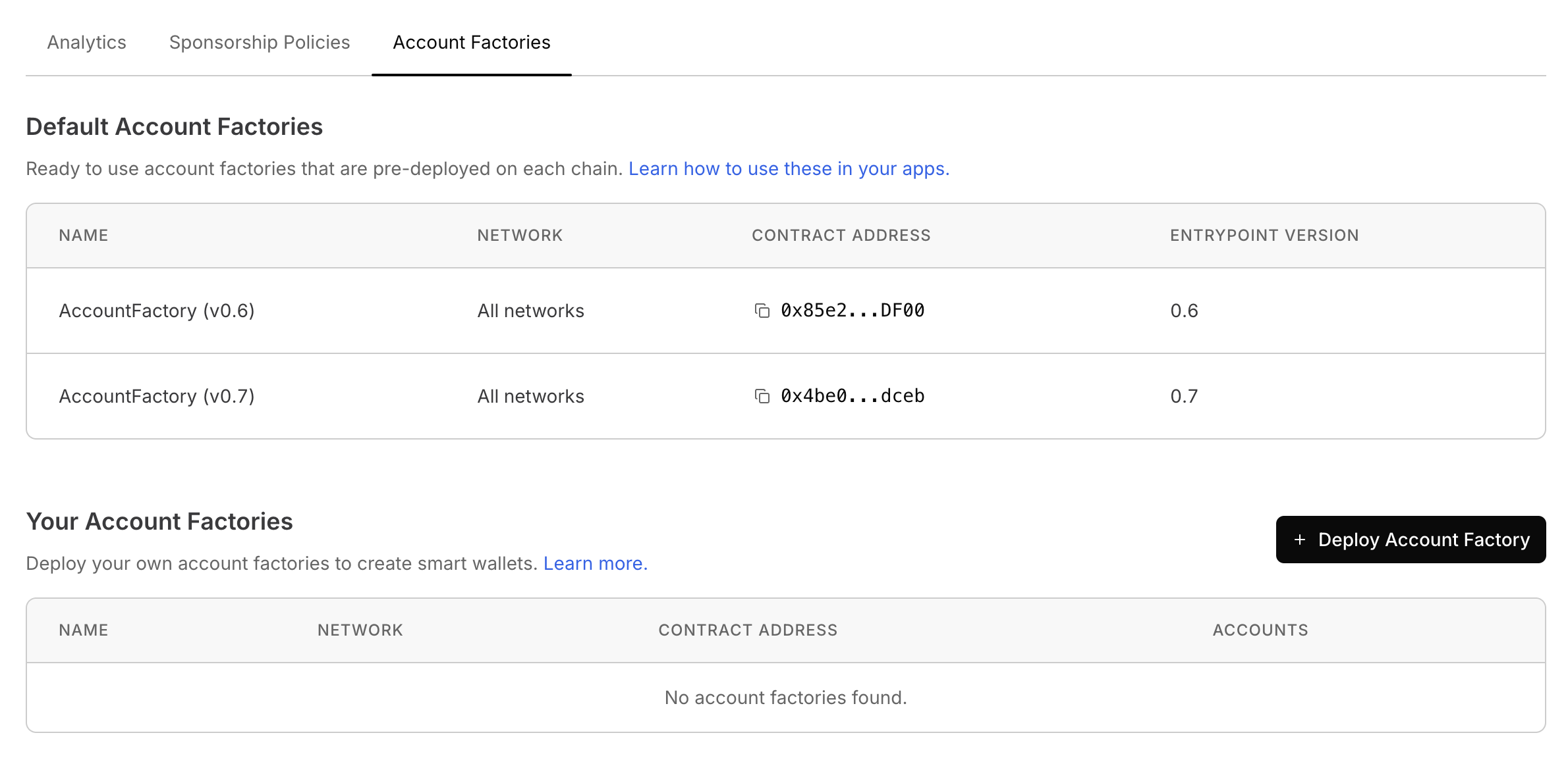 This PR enhances the `AccountFactories` component by introducing a section for default account factories and a table to display them. It improves user guidance on deploying custom factories and organizes the layout for better clarity.