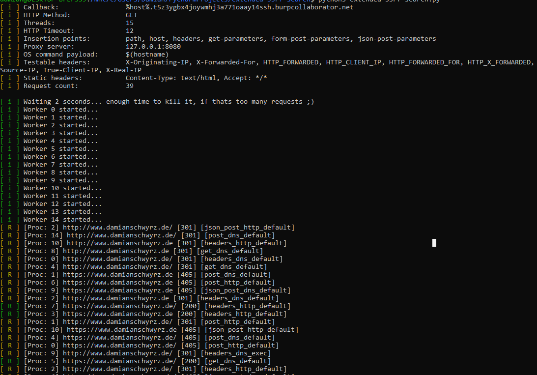 Rename example.app-settings.conf to app-settings.conf and adjust settings. The most important setting is the callback url. I recommend to use burp collaborator. Then you can add your urls to config/url-to-test.txt. Here the script accepts domains as well as urls with path and queryparameters. If you like you can add your own cookies to config/cookie-jar.txt and add additional headers for your requests. The brute force list which is used in post and get requests is currently small, I dont thing adding 2000 parameters is smart. We should focus on those which have the highest possibility to be vulnerable. If you don't think so: just add your own!