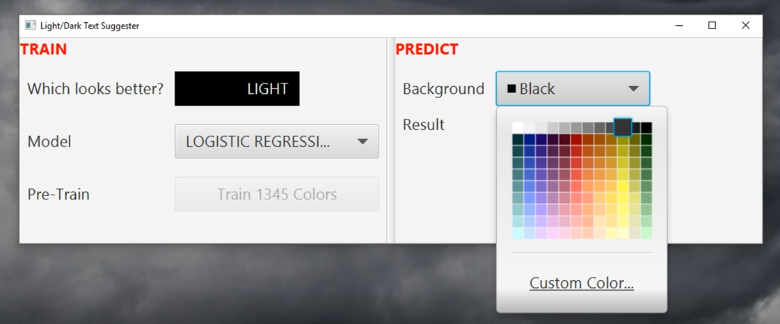 This is a Kotlin application that experiments with different machine learning algorithms to recommend a light/dark font against different background colors.