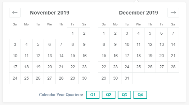 Various preset choices are available to enable quickly selecting date ranges such as calendar year quarters, recent days, and US government quarters.