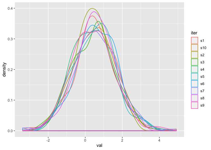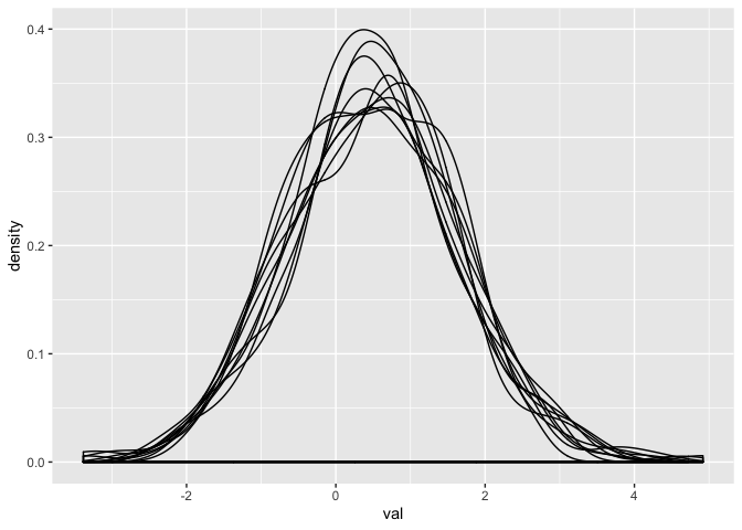 geom_density()ggplot(tbl, aes(x = val, color = type, group = iter)) +