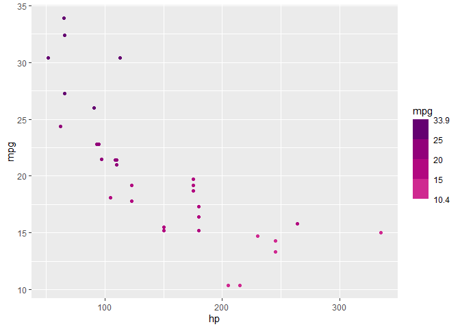 ggplot(aes(hp, mpg, color = mpg)) +
