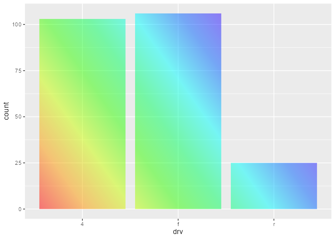 p + geom_bar(fill = grad, alpha = 0.5) Radial gradients work as expected. grad <- radialGradient(rainbow(10))