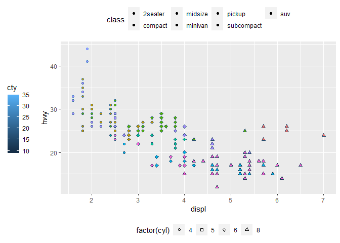 ggplot(mpg, aes(displ, hwy, colour = cty, shape = factor(cyl), fill = class)) +