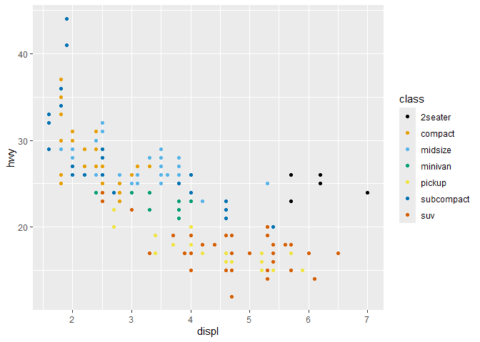 p <- ggplot(mpg, aes(displ, hwy)) +