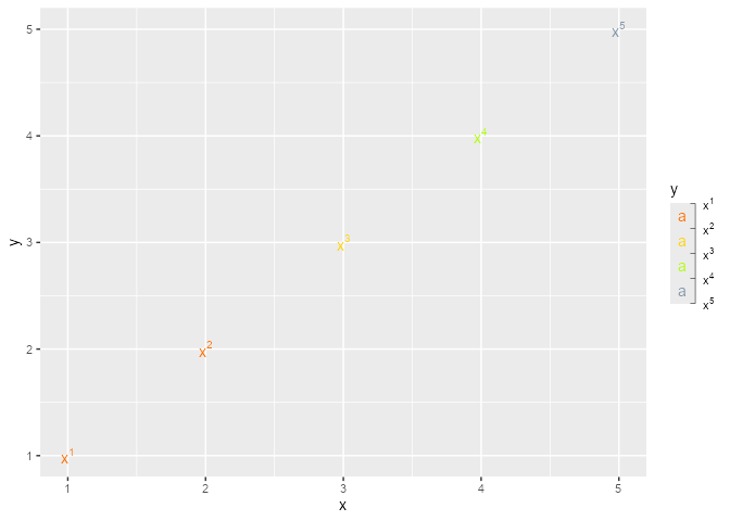 geom_text(label = paste0("x^", 1:5), parse = TRUE)+