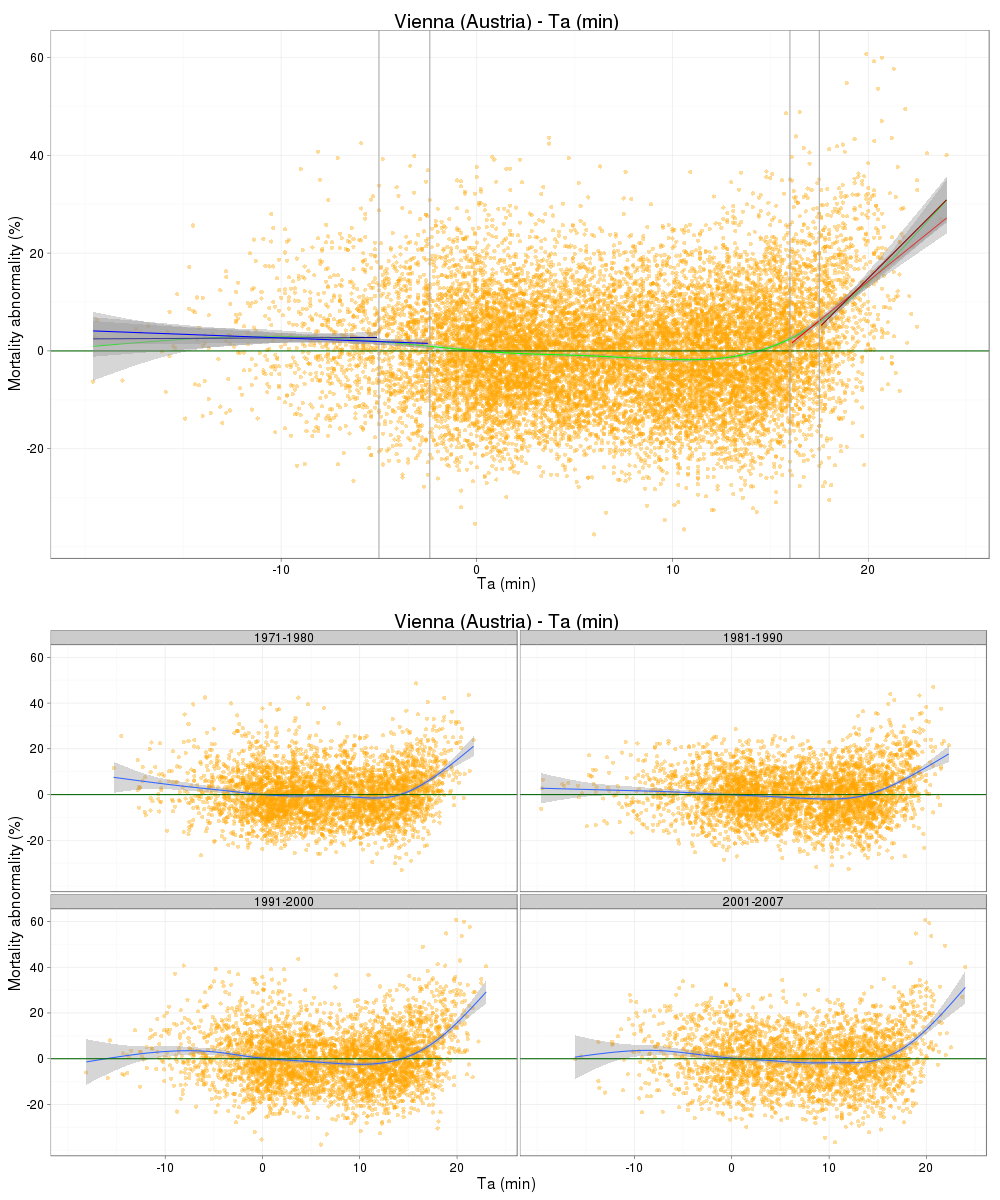 The scatterplot shows minimum air temperature of the day together with the mean mortality value of the day and the day after. The data shown is valid for Vienna, the capital of Austria. Mortality is described as difference to the expected value. Linear regression lines for the 5, 10, 90 and 95 percentile range are added additionaly to the ggplot2 smooth. The plots shows a strong increase in the mortality values for minimum air temperature above 16°C. For cold temperatures an increase occures after a delay of some days.