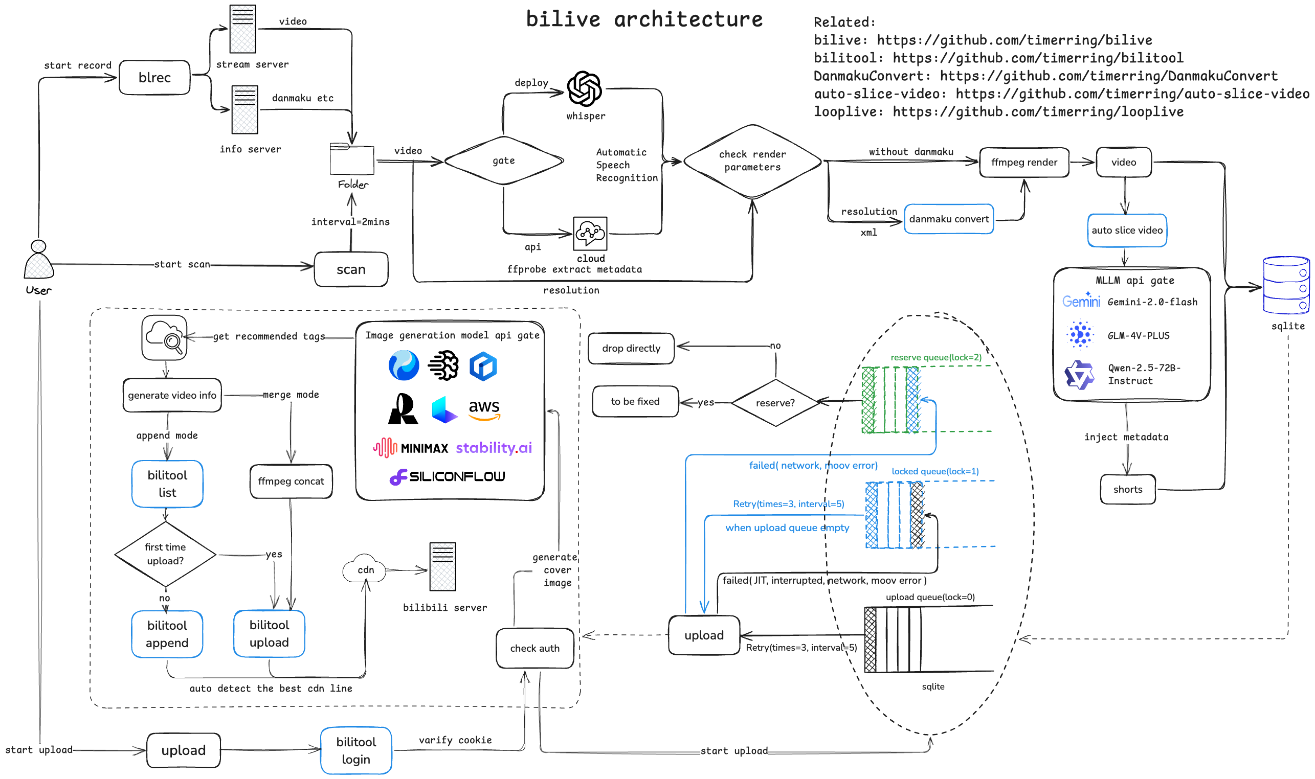 | 6 | +Automatically monitors and records Bilibili live broadcasts and danmaku (including paid comments, gifts, etc.), converts danmaku according to resolution, recognizes speech and renders subtitles into videos, splits exciting fragments according to danmaku density, and generates interesting titles through video understanding models, automatically generates video covers using image generation models, and automatically posts videos and slices to Bilibili, compatible with the version without GPU, compatible with low-configuration servers and hosts. |