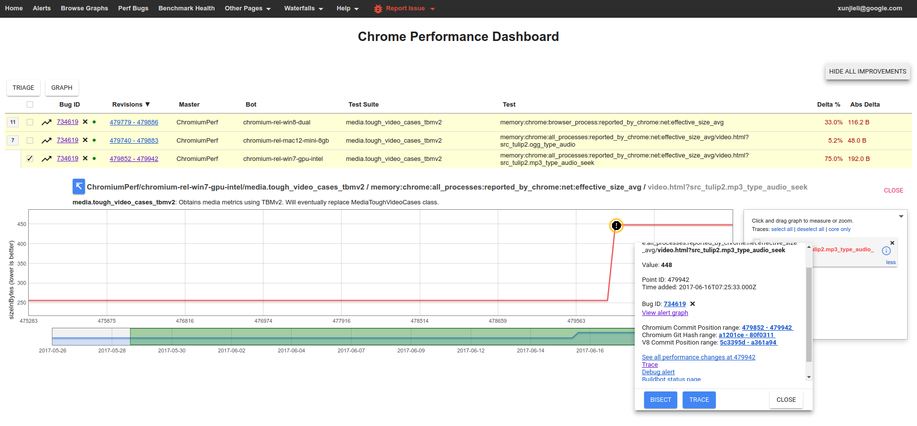 If you are investigating a Perf dashboard alert and would like to see the details, you can click on any point of the graph. It gives you the commit range, buildbot output and a link to the trace file taken during the buildbot run. (More information about reading trace files here)