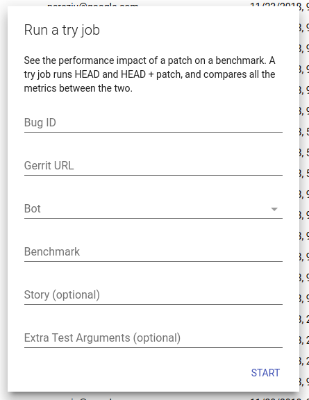 - Gerrit URL: URL to the patch you want to test. Note that your patch can live in chromium or any of its sub-repositories!
