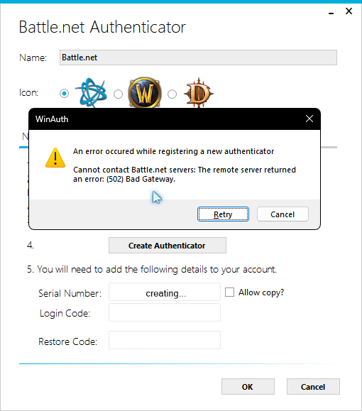 Cannot contact Battle.net servers: The remote server returned an error: (502) Bad Gateway.