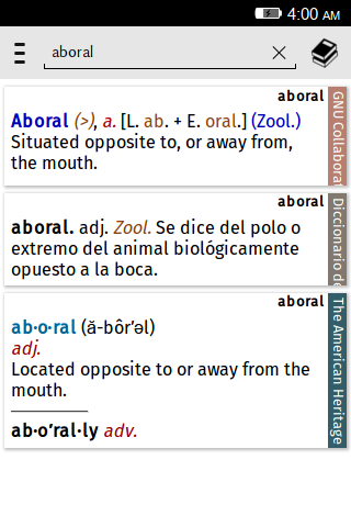 Currently, only StarDict dictionaries are supported. Users can organize many dictionaries by renaming, coloring, reordering them and by classifying them in groups. The last 20 terms that have been looked up are stored and can be accessed directly from the start screen.