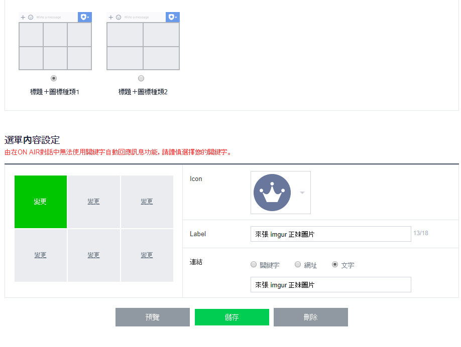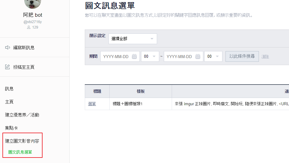 建立圖片影音內容 -> 圖文訊息選單 ( 如下圖 )