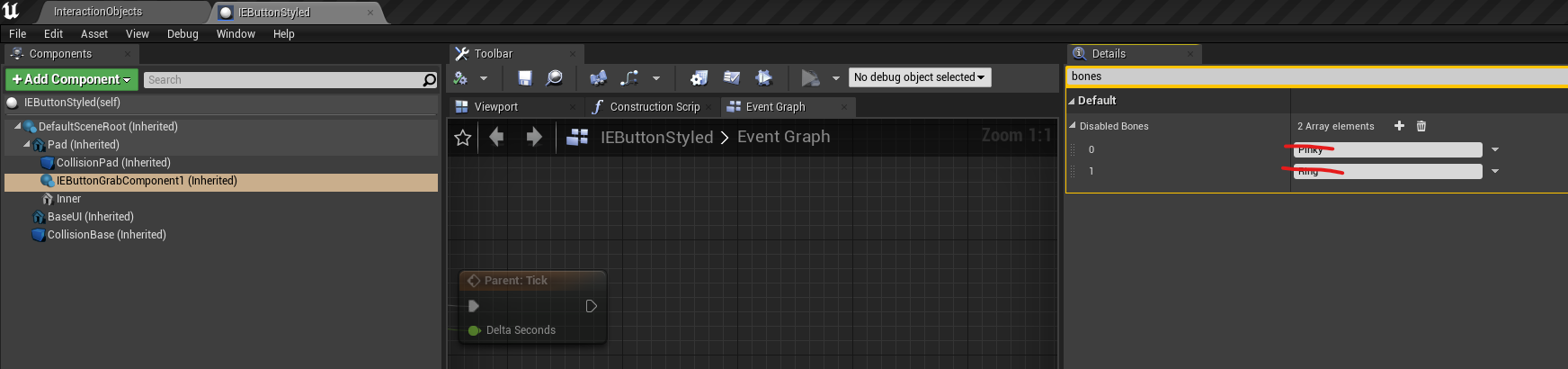 In addition, if you want to enable the smaller fingers so that they can push buttons, edit the IEButtonGrabComponent Disabled Bones list and remove Pinky and Ring.