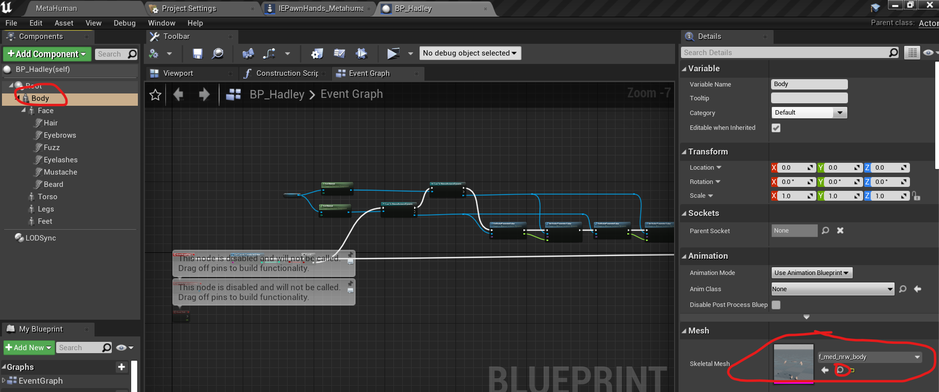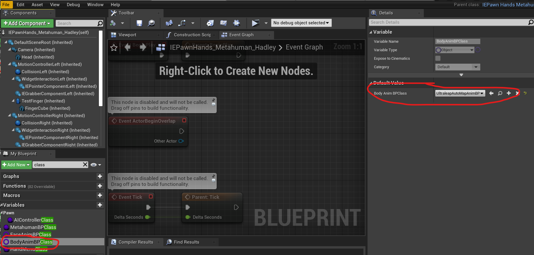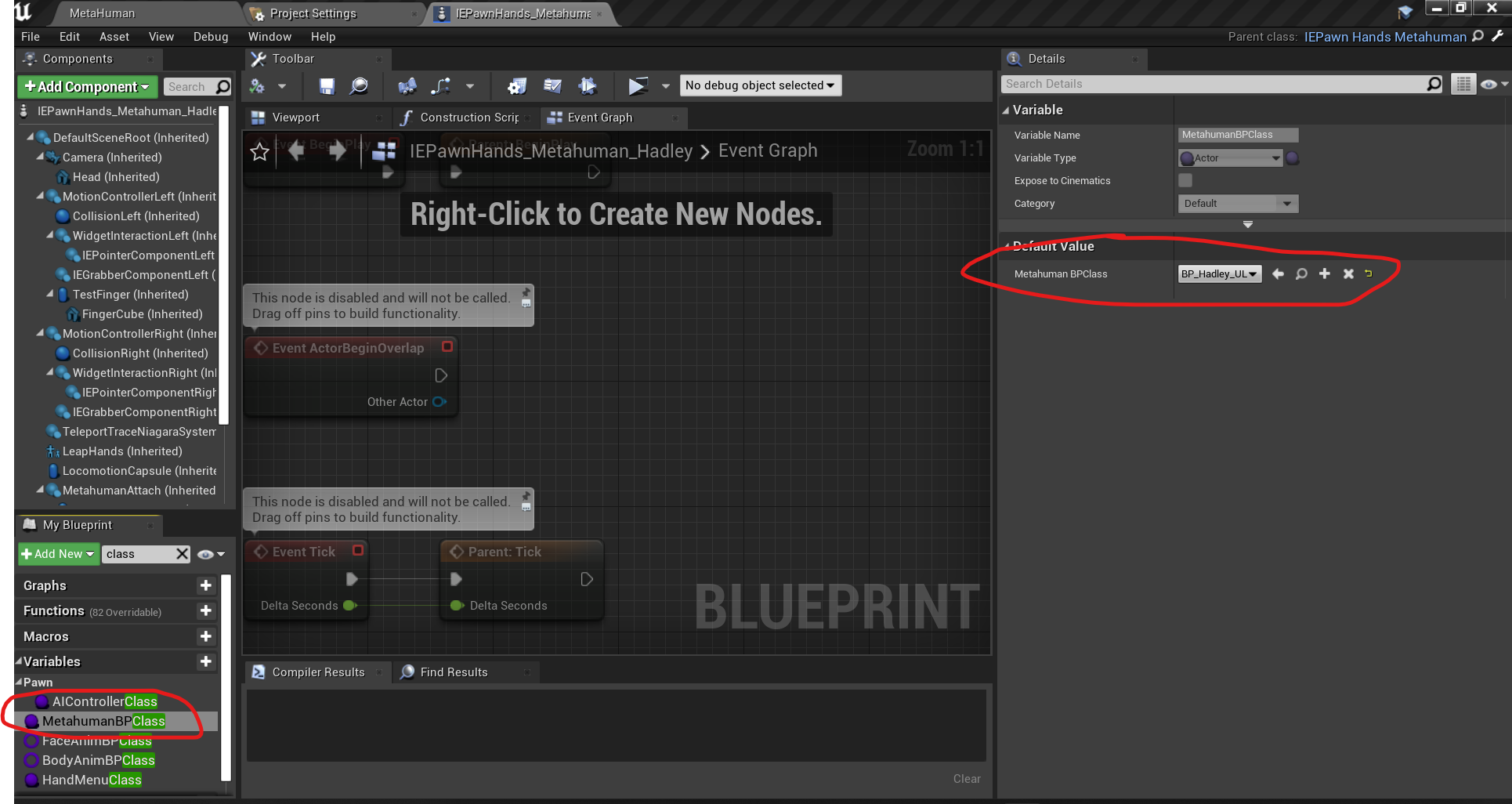 • Set the MetahumanBPClass member of your newly created class to your imported Metahuman blueprint (for example HadleyBP) image6