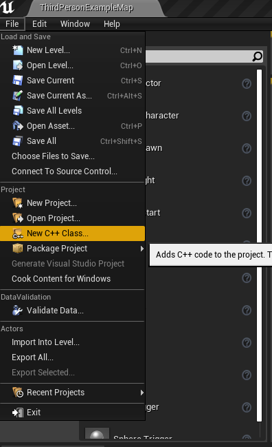 • Go to File->Add C++ class and add an empty C++ class to the project. It doesn't matter what it's named