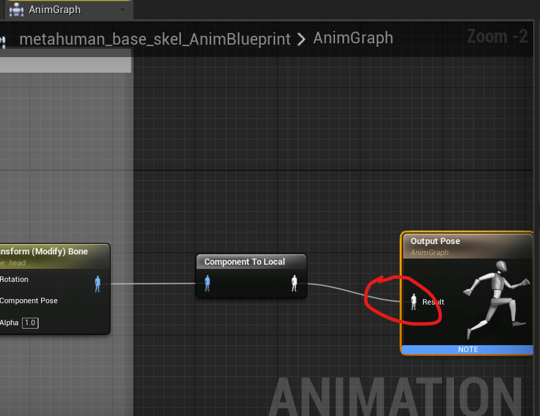 • Connect up the last pin in the animation graph to the Output Pose node. image14
