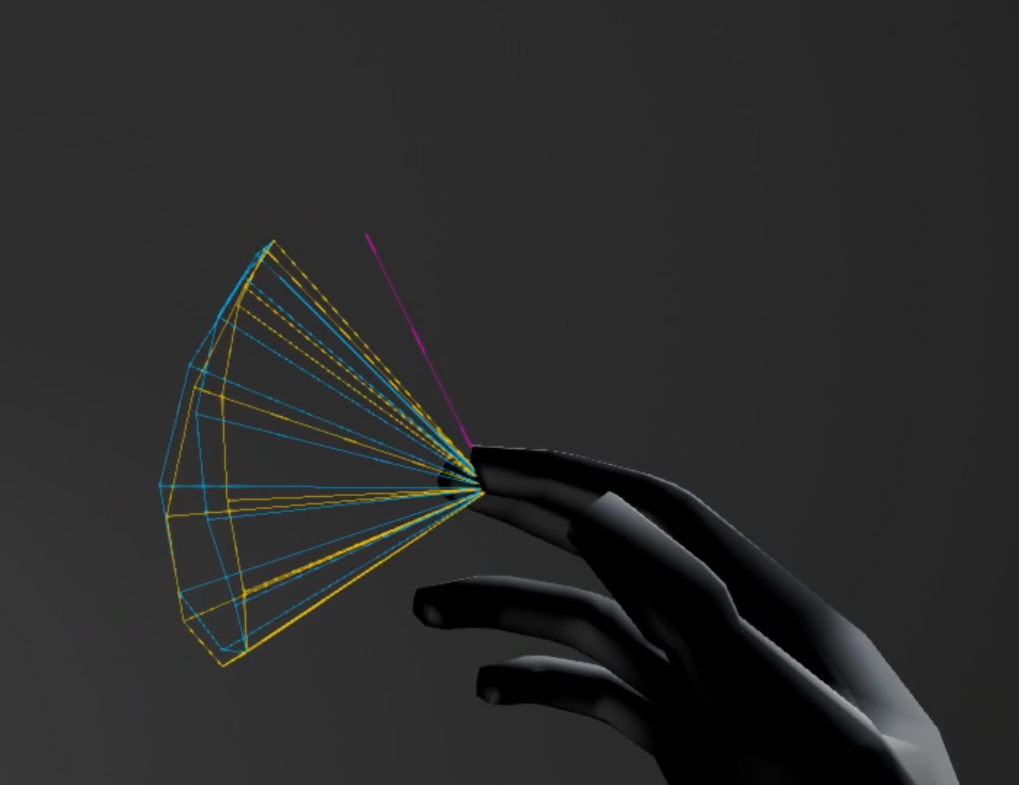 Triggers when a given finger points in a given direction over a given angle tolerance (see cone extending from the finger)