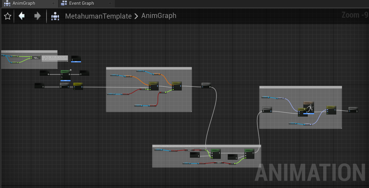 • Copy the nodes from the template UltraleapTracking/Metahumans/MetahumanTemplate provided (anim graph and eventgraph) into your anim blueprint. image11 image12