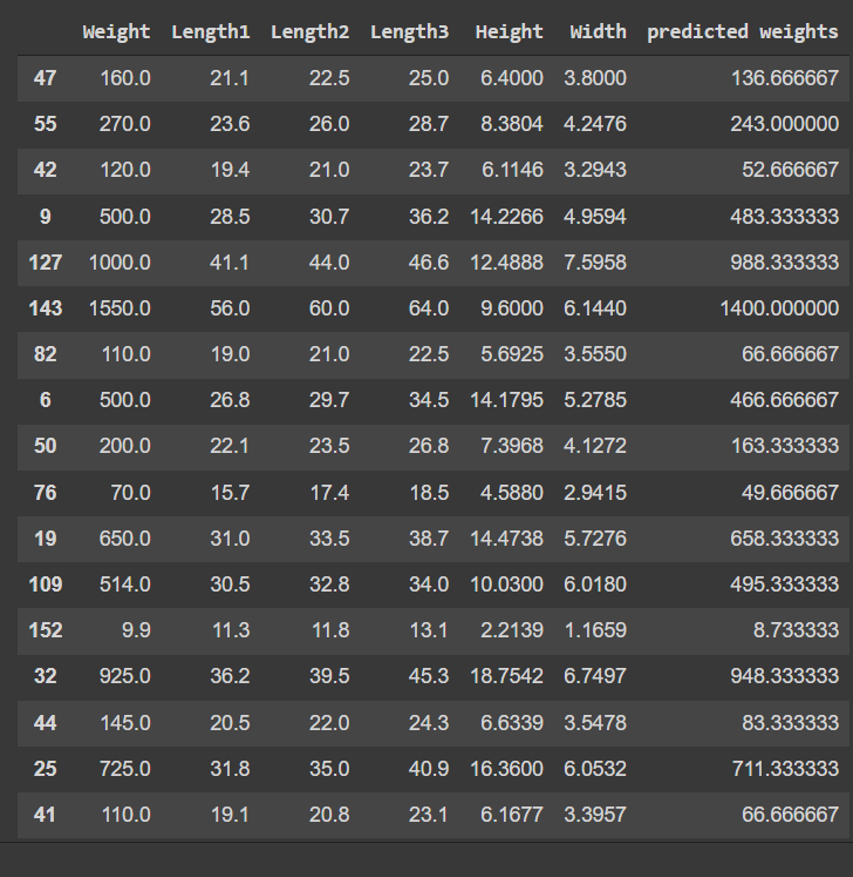 So, we used k = 3 for the prediction of the weight of fishes. As we get minimum RMSE on 3 which is approximately 47. The prediction results are given below: