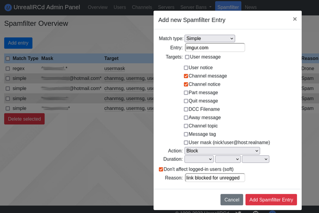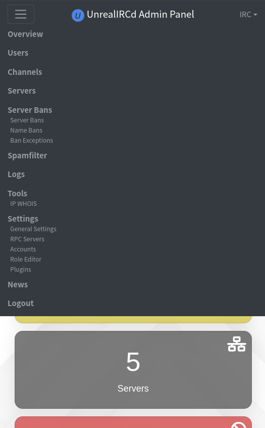 The UnrealIRCd Administration WebPanel gives you an overview of your IRC network, with detailed information about servers, users and channels. You can easily add and remove server bans, spamfilters and do other administrative tasks, all from the convenience of your web browser.