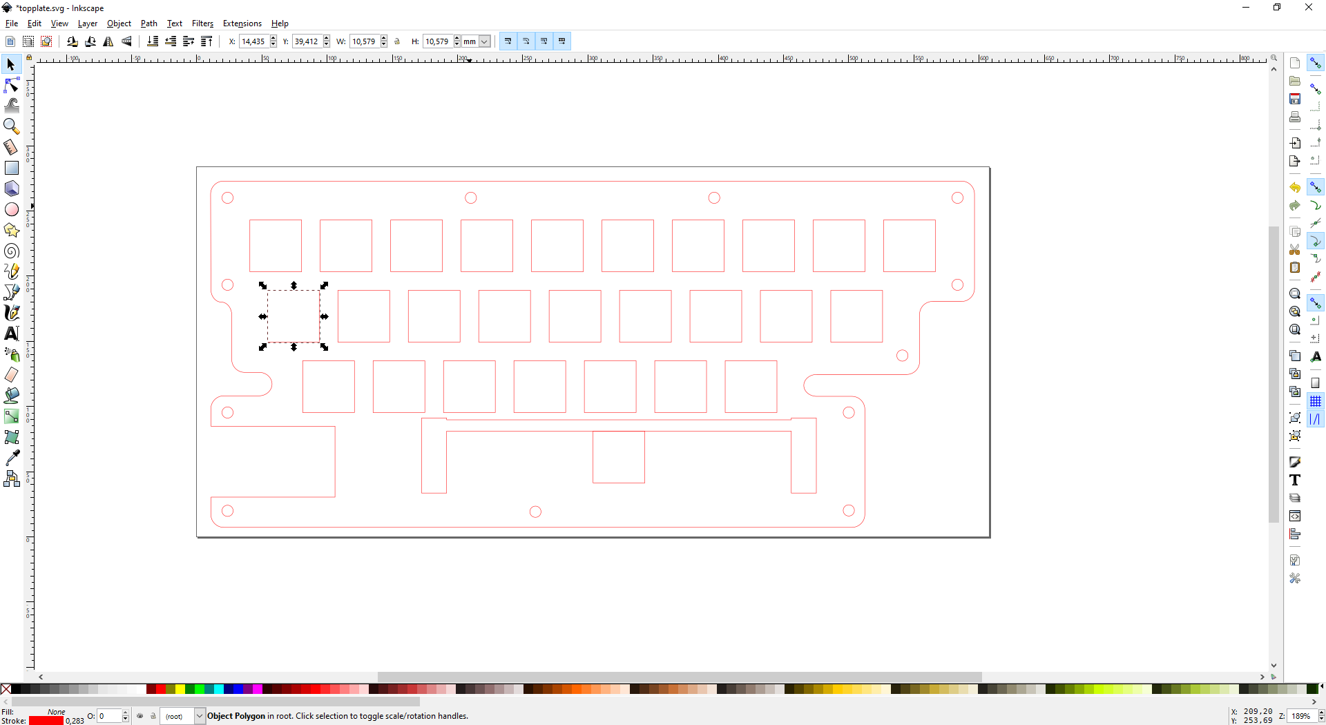 I cut the `topplate.svg` file today, and get wrong width and height of the switch holes. After checked on Inkscape, the size is `10.579 mm`. I use Inkscape v0.92