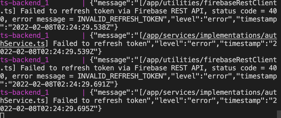 {"message":"[/app/utilities/firebaseRestClient.ts] Failed to refresh token via Firebase REST API, status code = 400, error message = INVALID_REFRESH_TOKEN","level":"error","timestamp":"2022-03-05T19:26:26.597Z"}