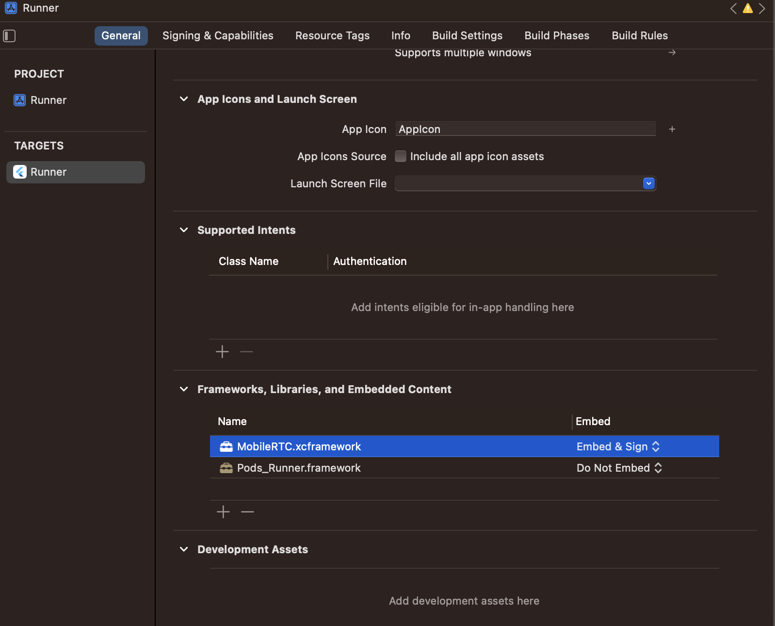 is added in TARGETS/Runner/Frameworks,Libraries, and Embedded Content