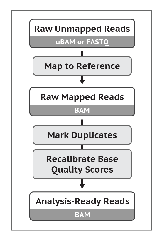 - References (genome in fasta, dbSNP vcf, 1000 Genomes vcf, Mills and 1000 Genomes Gold Standard vcf), available in GATK Bundle.