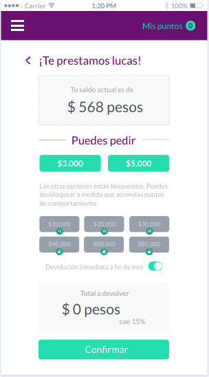 - Puedes pedir $5.000 pesos las otras opciones están bloqueadas pero puedes desbloquear a medida acumules puntos de comportamiento**