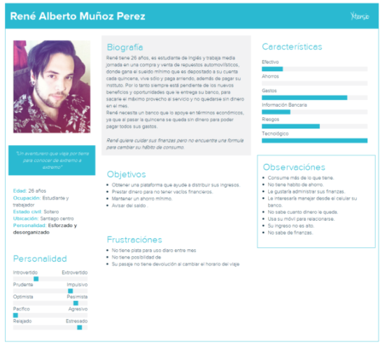 El user persona se creó a partir de los patrones que se encontraron en las encuestas y cuestionarios, se encontró que se abandonaba el tema de los ahorros y préstamos además comunicándonos con un entrevistado descubrimos que había un perfil que era común y era de la gente que gasta más de lo que tiene o que no tiene dinero todo el mes, teniendolas que arreglar varios días.