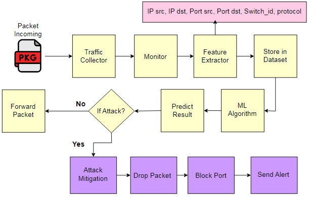 When traffic flows into the system, the OpenFlow protocol assists by collecting data flows from the switches and pushing the information to the detection module. Here, the module conducts statistical analysis based on the data provided by the switching devices. After conducting statistics for approximately 20s to 30s, the machine learning model predicts whether an attack is occurring. If yes, continuous alerts are sent to the administrator.