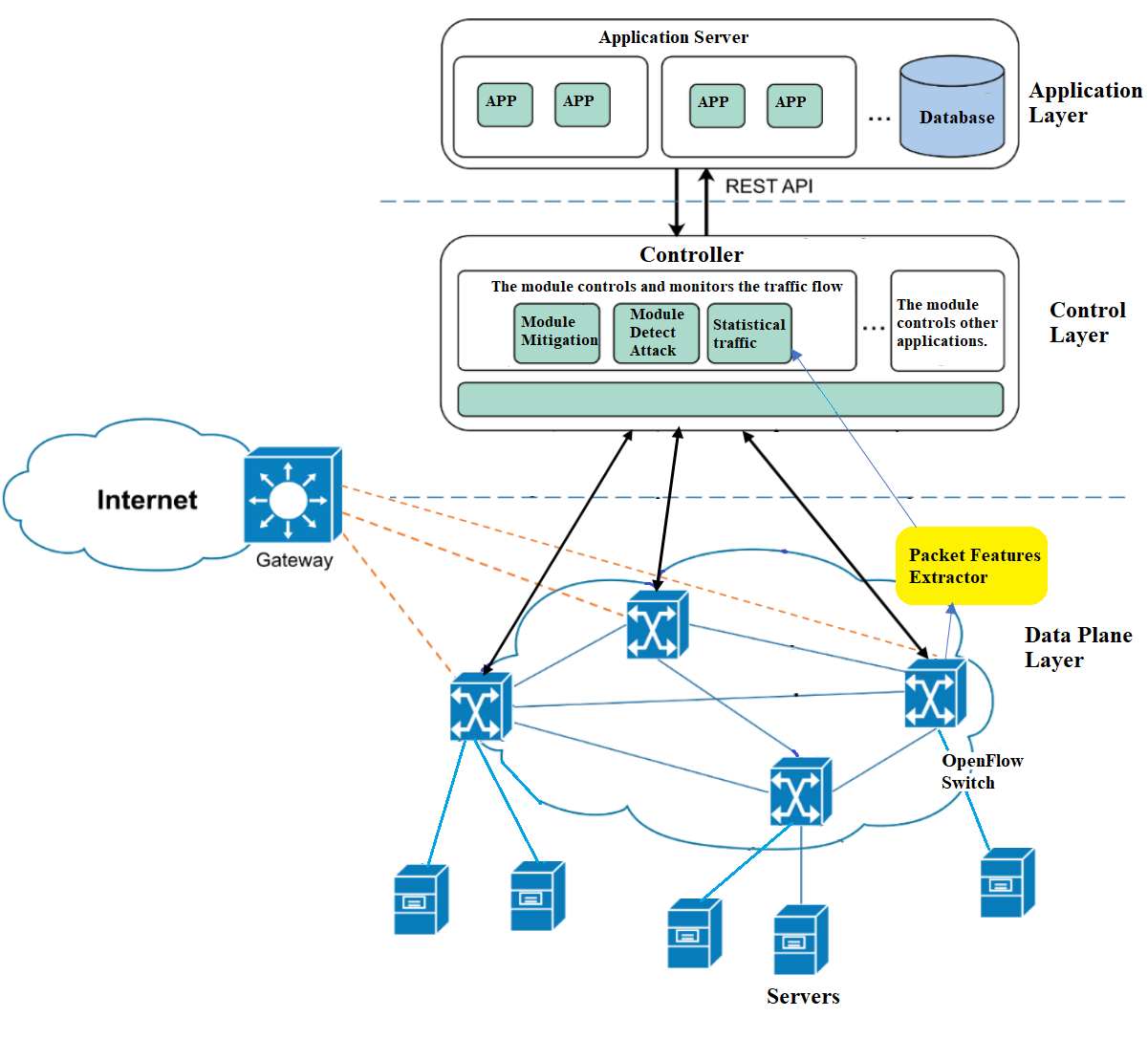 The studies [2,3,4,5] have proposed methods to prevention DDoS attacks. Although the authors have introduced flexible and easily integrable models compatible with diverse infrastructures, [2] is specifically applied to IoT systems, and [3] is suitable for LR-DDoS prevention. In the research [4,5], the authors presented a system operating as an IDS/IPS to detect attacks promptly. In [6], the authors extracted packet header fields such as IP, port, switch, etc.. to traffic statistics and attack detection. In [7], the OpenFlow protocol was employed to support statistical methods and communication between network components.