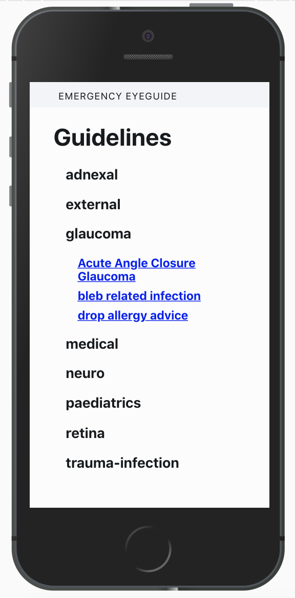 At the London NHS Hackday 2018, our group created EyeGuide a reference app to help users find relevent management clinical guidelines at their fingertips. It will enable junior doctors, new staff, non-UK trained doctors to manage patients in a standardised, safe way, in the most stress free way possible.