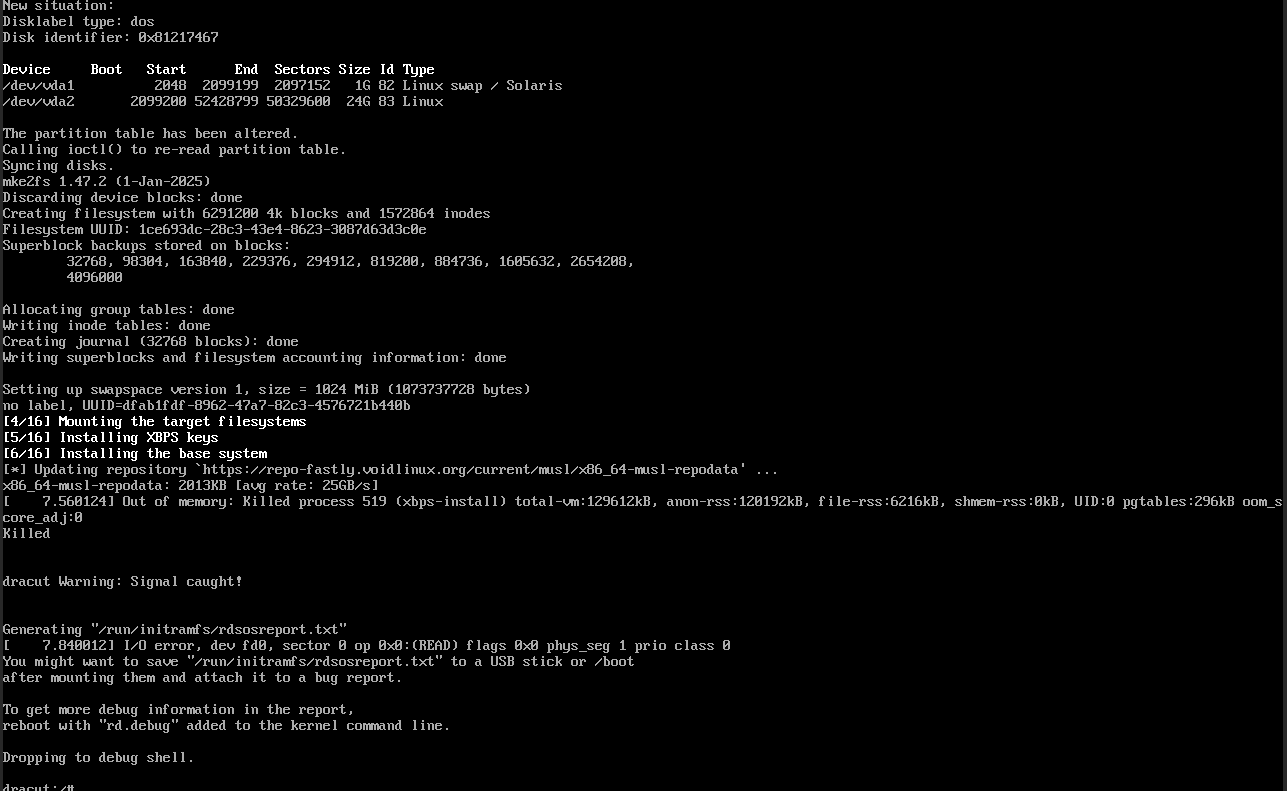 The point is this image ends up in trouble because xbps-install triggers an OOMkill reliably. I believe xbps is allocating a lot of memory where it didn't always, and the system has a 512 meg limit. If I increase the system RAM from the default (512) to 648 megs, the install works flawlessly.