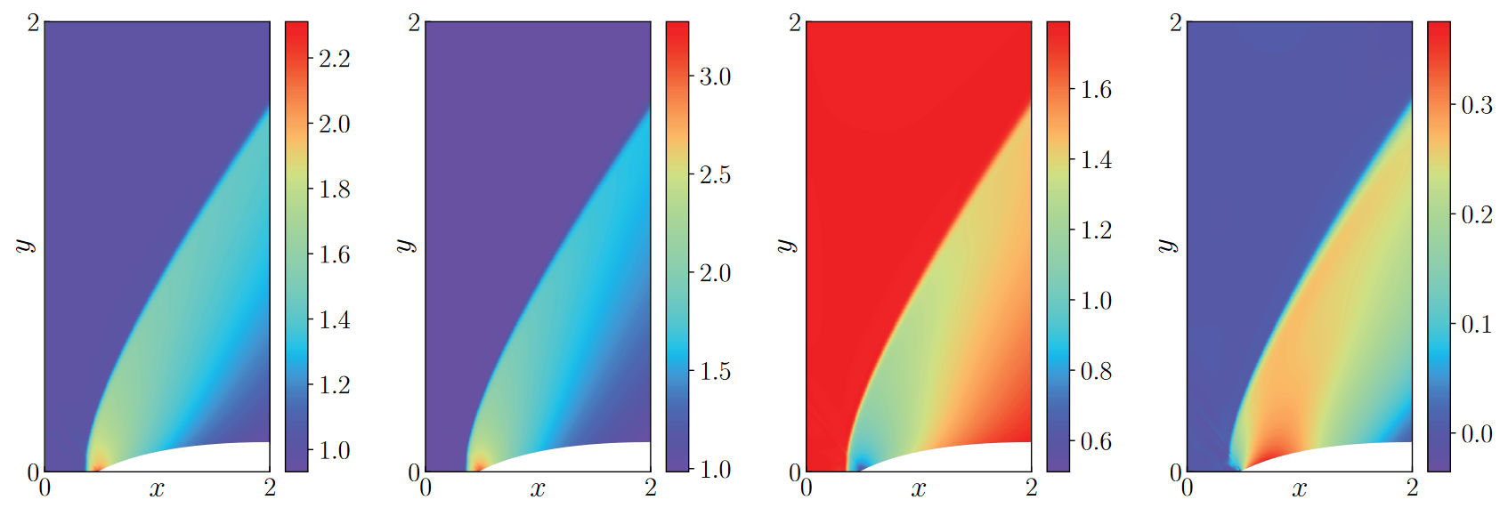 Simply run the .py files from the main folder of this repository. It will generate a pickled .p file that contains the history of the metrics and the network parameters at regular intervals. The file utils.py contains functions that can be used to load the pickled files. To reproduce the figures in the report, have a look at the example_figure.py file which shows how for example the density can be plotted for the detached shock wave.